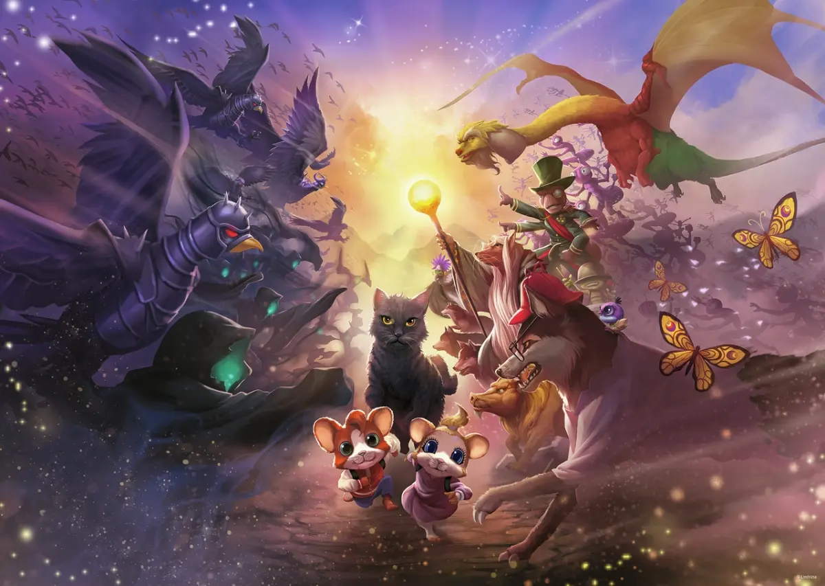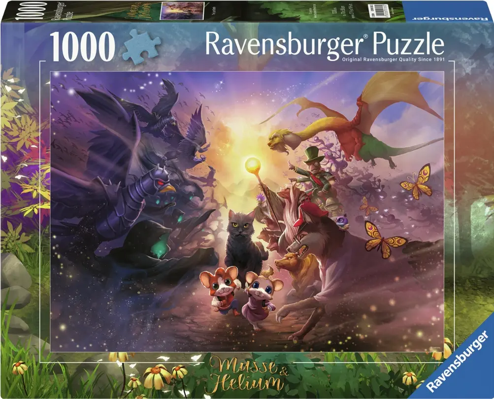 Musse och Helium flyr beslutsamt från alla möjliga faror, genom ett magiskt landskap. Omkring dem syns både drakar, vargar, katter och magiska väsen. Trotts farorna springer de modigt vännerna fram på stigen med ett leende på läpparna!