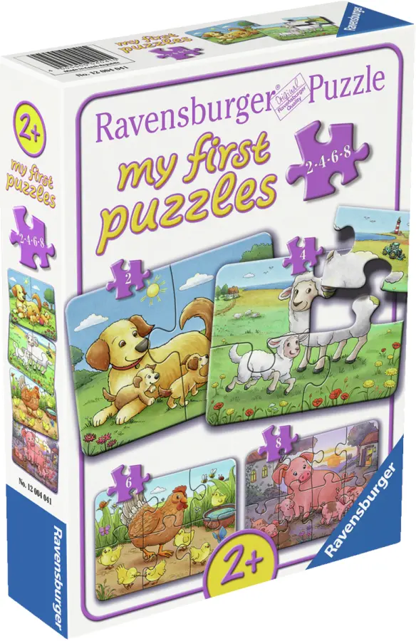 Fyra pussel på 2, 4, 6 och 8 bitar. Samtliga med olika motiv av djur på landet med sina ungar. Vi ser en hund med valpar, ett får med sitt lamm, en höna med kycklingar och en gris med kultingar. Ett perfekt pussel för små barn där de får öva både motorik, logik och djur på en och samma gång.