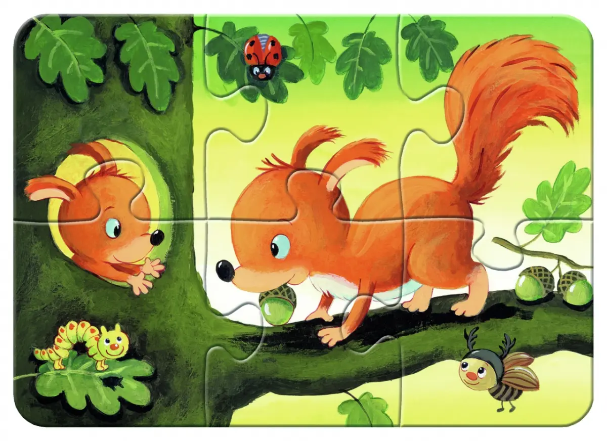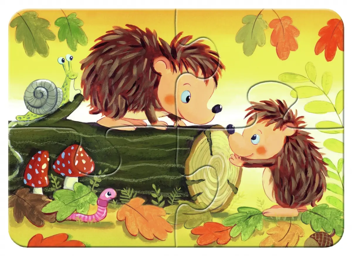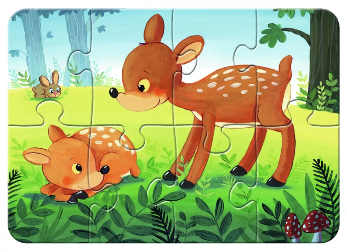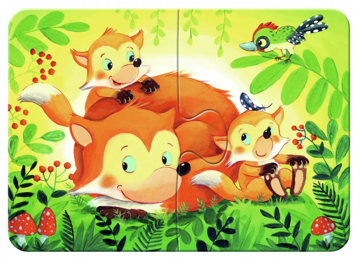 Fyra pussel på 2, 4, 6 och 8 bitar. Samtliga med olika motiv av djur i skogen och deras ungar. Vi ser rävar, igelkottar, ekorrar och rådjur.