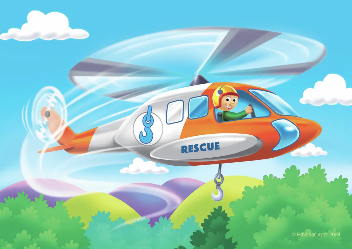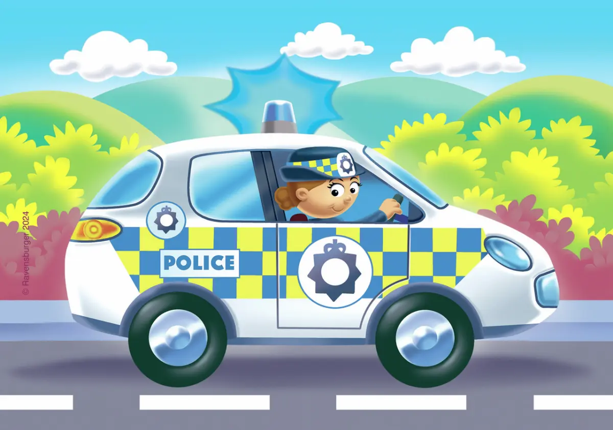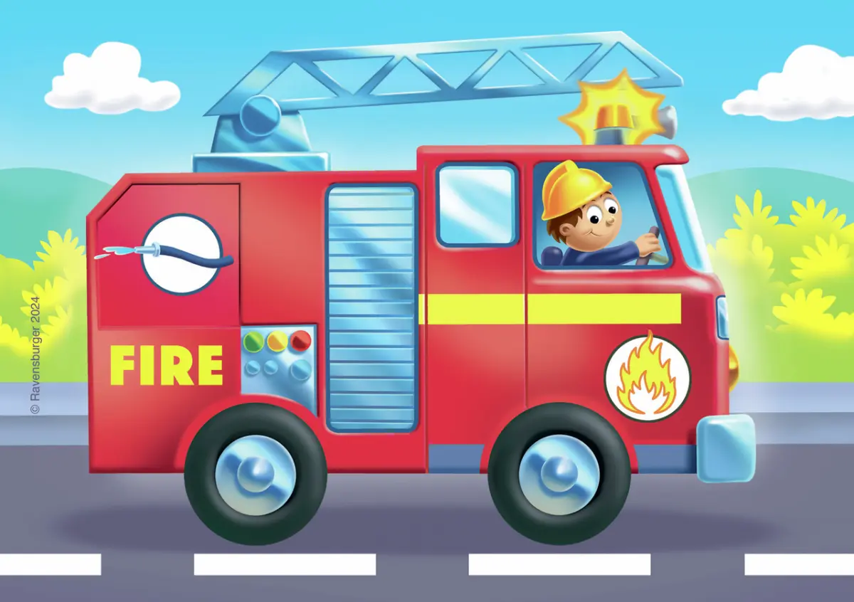Fyra pussel på 2, 3, 4 och 5 bitar. Samtliga med olika motiv av utryckningsfordon i farten. Ett perfekt pussel för små barn där de får öva både motorik, logik, yrken och fordon på en och samma gång.