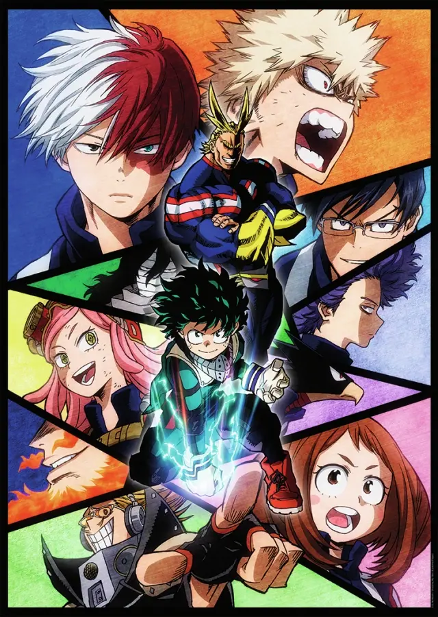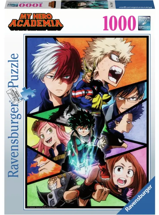 Ett pussel med kollage av karaktärer från anime-serien "My hero academia" (Boku no Hīrō Akademia på japanska). På motivet illustreras karaktärerna Katsuki, Bakugo, All Might, Izuku, Shōta, Tenya, Mei, Hitoshi, Fumikage, Enji, Ochaco och Hizashi.