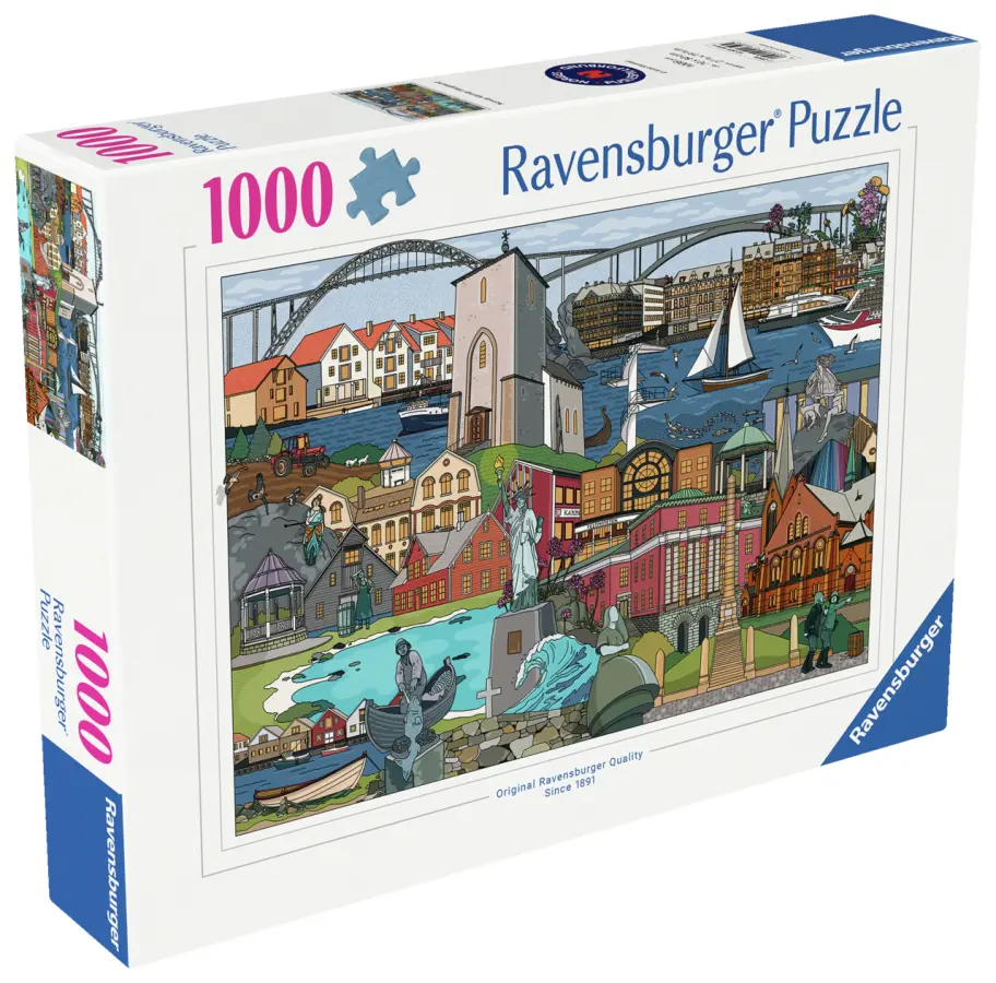 Konstnären Anita Meistads tolkning av sin hemstad Karmöy i Hugesund, Norge. I motivet syns kända landmärken och symboler för öns rika kulturarv.