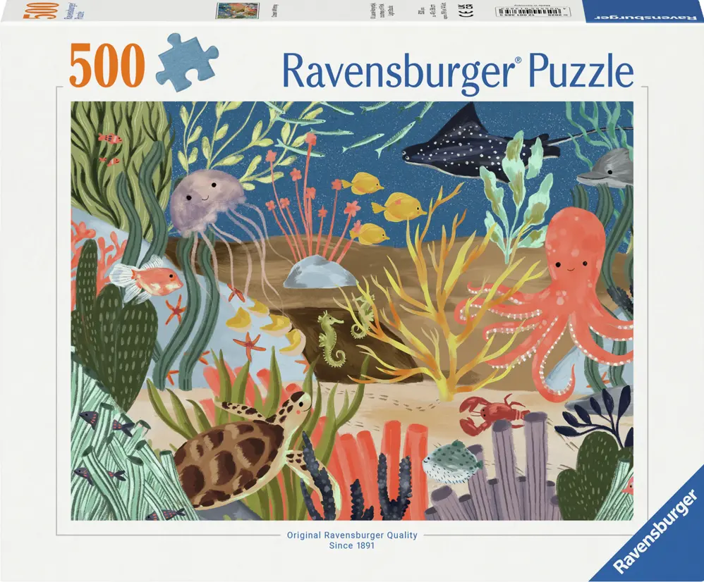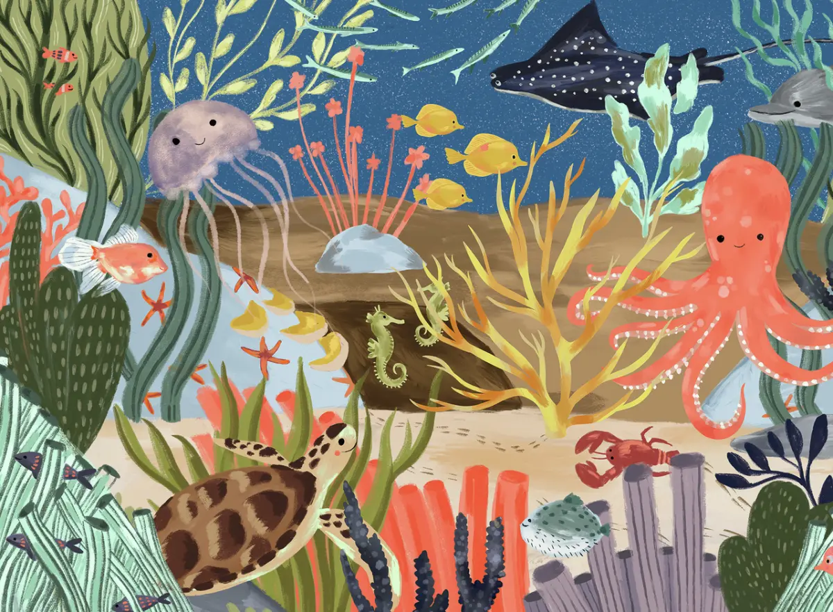 Ett målat motiv i pastellfärger där vi ser glada havslevande djur under vattenytan. Här simmar bland annat maneter, sköldpaddor, sjöhästar, bläckfiskar och rockor tillsammans i harmoni bland stenar och koraller.