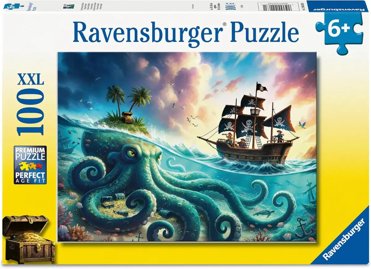 Skepp ohoj! Piraterna på det beryktade piratskeppet har hissat sina svarta segel och är på väg mot en ö med en värdefull skattkista fylld av guldmynt. Men vad de inte ännu vet är att en rikare skatt ligger under ytan, och vaktas av en gigantisk bläckfisk som har ön på sitt huvud. Vraken på botten vittnar om att andra har försökt få tag på skatten förut, men gått ett dystert öde till mötes! Ett spännande pusselmotiv för alla små pirat fantaster.