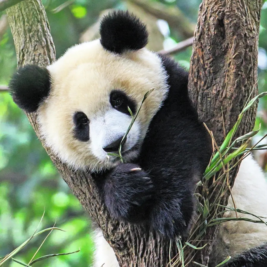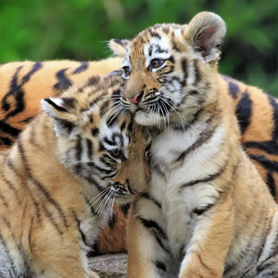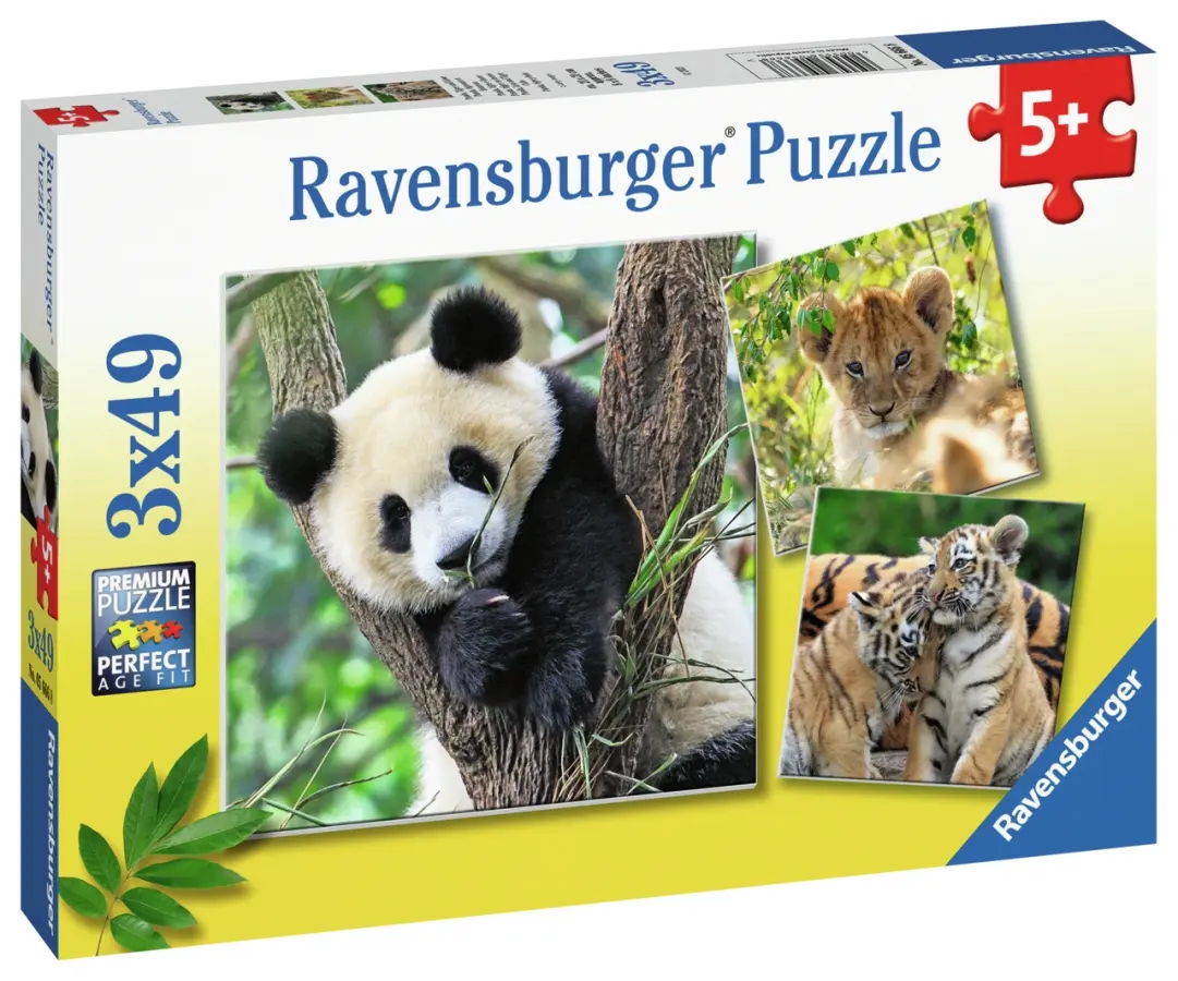 Tre pussel på 49 bitar vardera, med olika djurmotiv. En panda som klättrar i träd, en lejonunge som ligger i gräset en solig dag och två söta tigerungar som gosar med varandra.