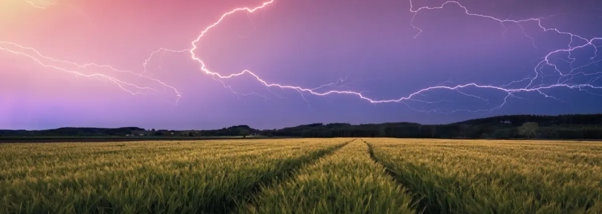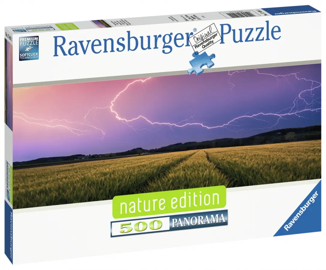 Ett fält breder ut sig framför oss, och på en himmel i lila och rosa toner leker blixtarna. Motivet är ett fotografi av den prisade naturfotografen Stefan Hefele. Pusslet har panorama format.