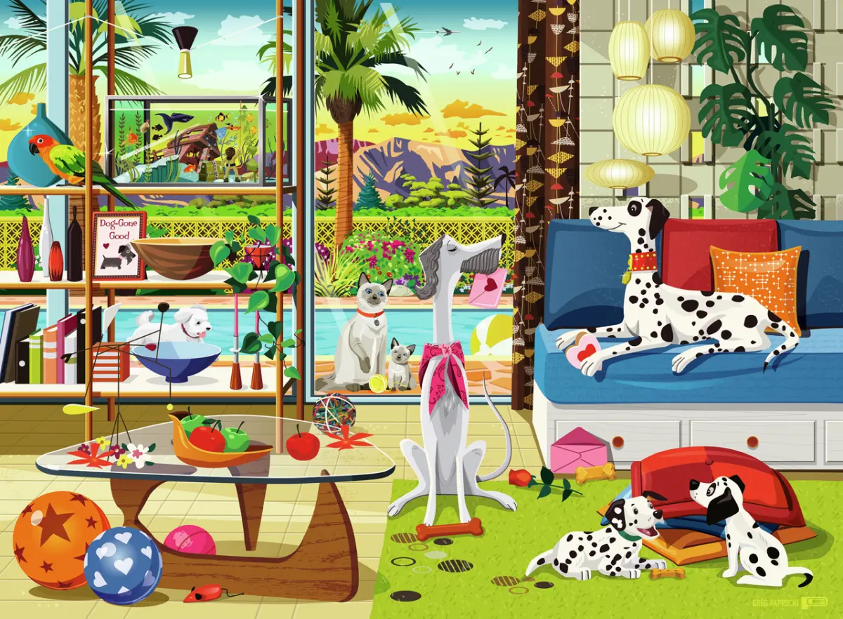 Hundar och katter lever ett gott liv i det lyxiga hemmet i Palm Springs (södra Kalifornien, USA). Här finns bollar och garnnystan att leka med, en skön soffa, mjuka mattor och så många hundben man kan önska sig. Dessutom trädgård med pool där man kan svalka sig en varm sommardag!