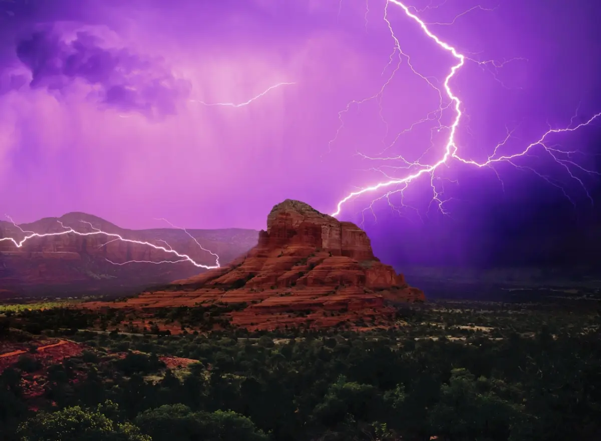 Över ett landskap av röda klippor och låg vegetation sprider sig ett oväder. Blixtar slår ner med full kraft och himlen är upplyst i lila toner.