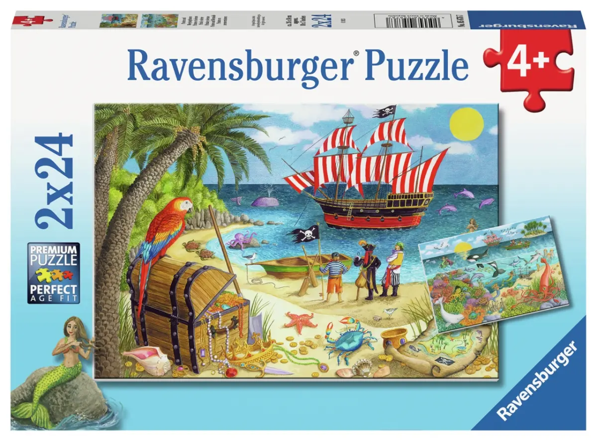På det ena pusslet har ett gäng pirater lagt till vid en strand, kanske ska de gräva ner sina skatter så att ingen annan kan hitta dem. Ön tycks ha ett rikt djurliv och en grönska med palmer. Längre ut på havet väntar deras piratskepp med hissade segel och piratflaggan fladdrandes i vinden. En sjöjungfru spanar på piraterna från en sten ute i vattnet.