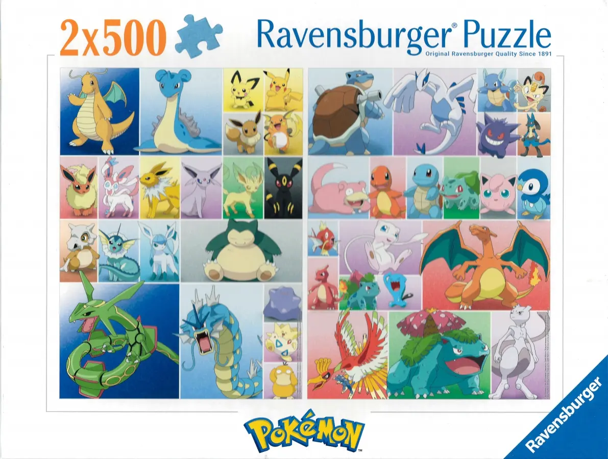 Två pussel med olika Pokemon motiv, på 500 bitar vardera (ligger i separata påsar i pusselkartongen).