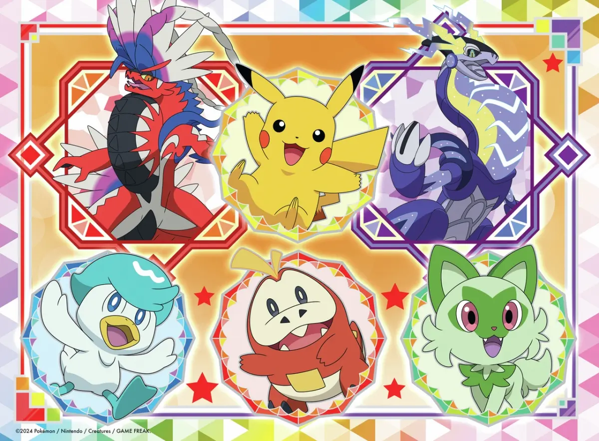 Ett färgglatt kollage av Pokemon-figurer ur serien Scarlet and Violet.