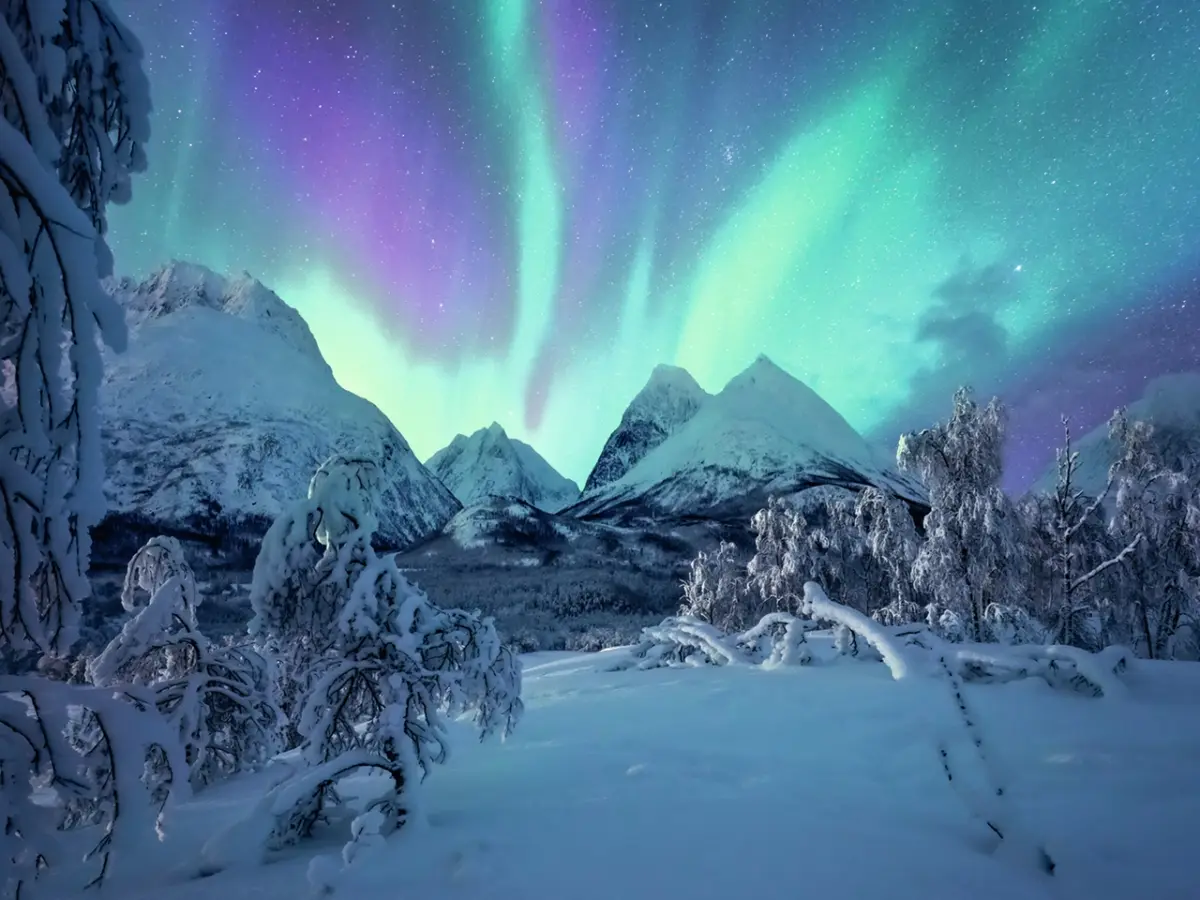 Ett otroligt norrsken i gröna och lila toner sprider sig p en stjärnklar himmel, över ett snötäckt bergslandskap.