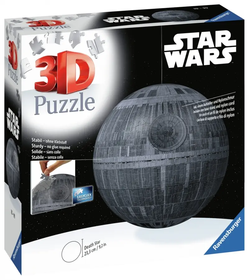 Du kan sätta ihop pusselbollen antingen fritt efter motivet eller efter nummer (alla pusselbitar är numrerade för att hjälpa dig i ditt pusslande). Tack vare EasyClick Technologi passar pusselbitarna perfekt ihop. När Dödsstjärnan väl är monterad är den mycket formstabil - helt utan lim eller verktyg. 3D-pusslet är lämpligt för vuxna Star Wars-fans och för små äventyrare från 10 år och uppåt. Iväg till nya galaxer!