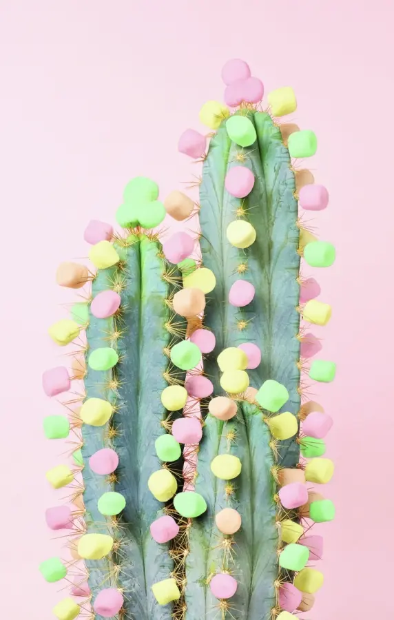 Någon har gjort en härlig godiskaktus av färgglada mini-marshmallows. Kaktusen står mot en glassrosa bakgrund.