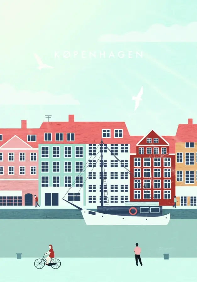 En illustrerad vy över Nyhavn i Köpenhamn med de klassiskt färggranna fasaderna och promenadstråket längs kajen där en segelbåt ligger förtöjd.