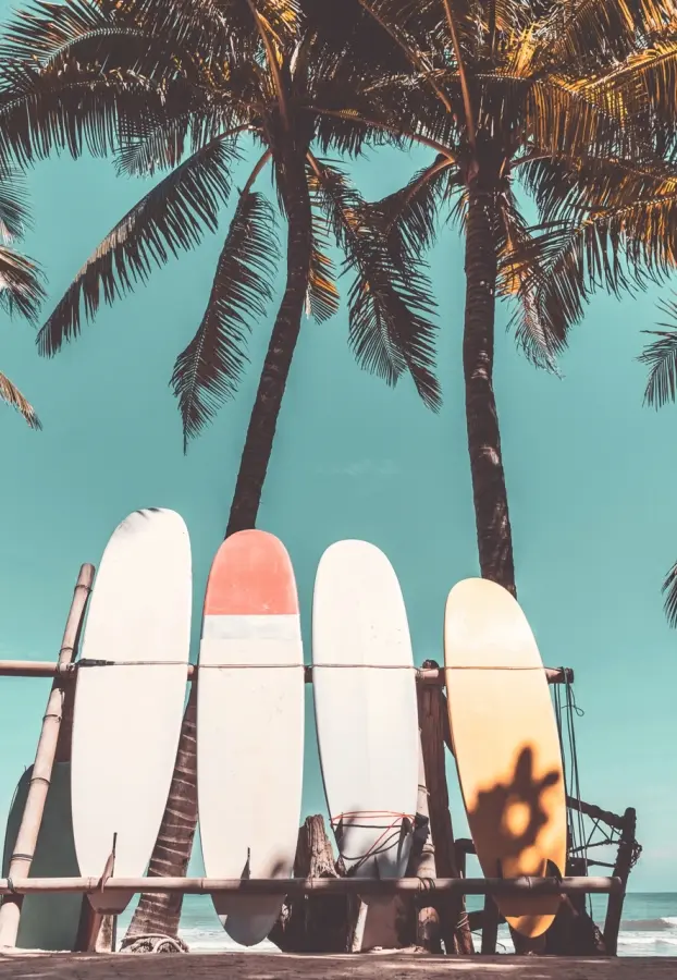 Fem surfingbrädor står uppställda på stranden i skuggan av en palm.