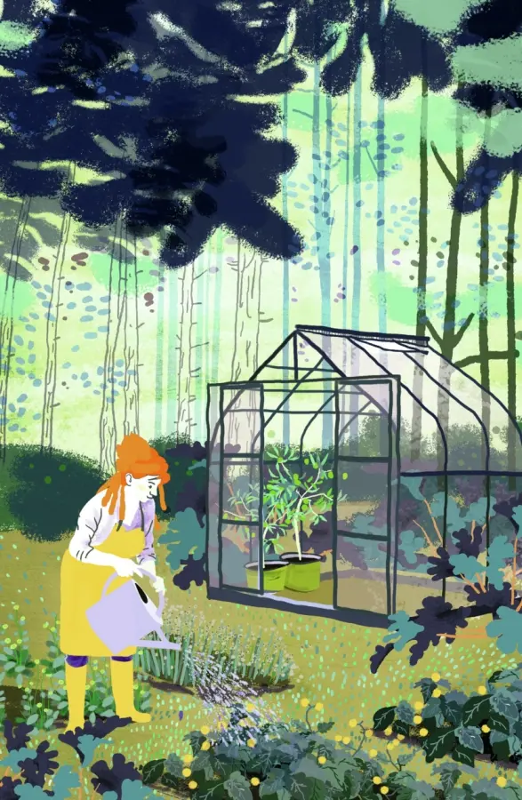 En kvinna i gult förkläde och gula gummistövlar är ute och vattnar i sin trädgård. Hon har ett växthus och i bakgrunden syns skogen med höga tallar som sträcker sig mot himlen.