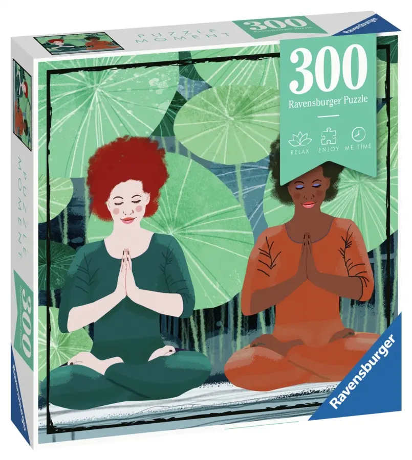 Två kvinnor sitter på marken i yogaposition, de är omgivna av vad som ser ut som stora gröna blad vilket bidrar till den harmoniska miljön i pusslet.