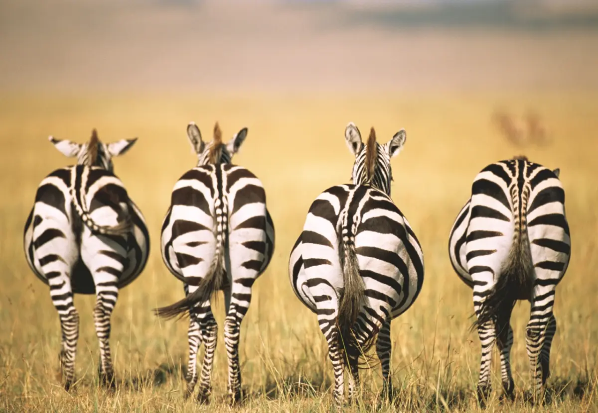 Med stolt svansföring är fyra zebror på väg bort på savannen. I bakgrunden skymtar vi det torra gräset och lite blå himmel.