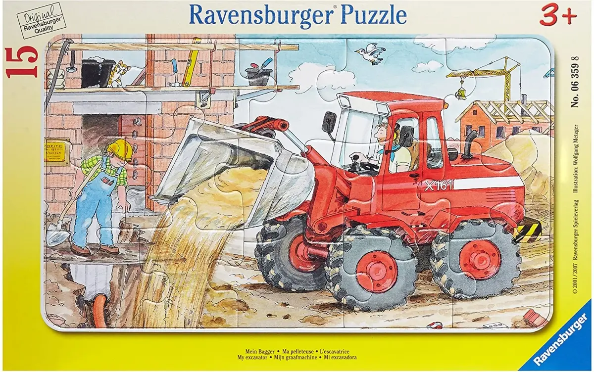 Bygget av det nya huset är i full gång, en katt tittar nyfiket på när den stora röda traktorn fyller igen en grop med sand. De nya rören är lagda och måste täckas noga. Ett härligt rampussel för alla små barn som gillar traktorer!