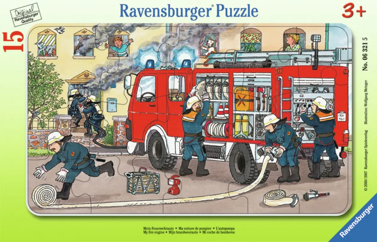 Det brinner i ett hus och brandmännen har anlänt med sin röda brandbil. Några av brandmännen är snabbt på väg in med en slang för att släcka eldsvådan och rädda människor och djur. Ett rampussel på 15 bitar med fartfyllt motiv.