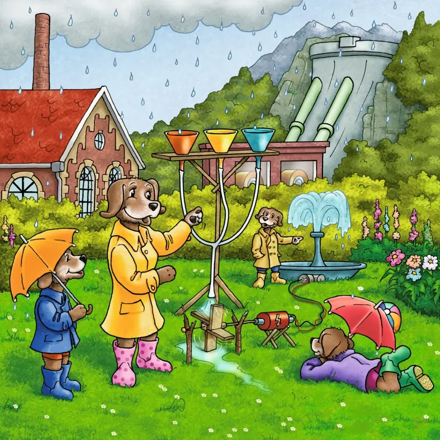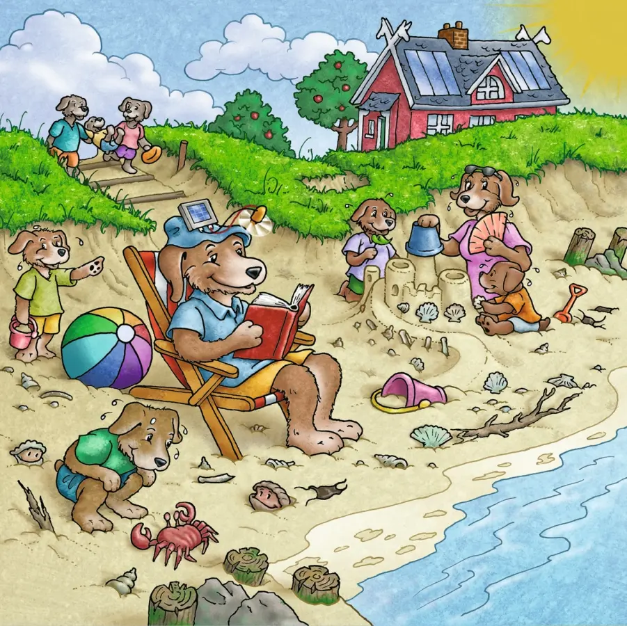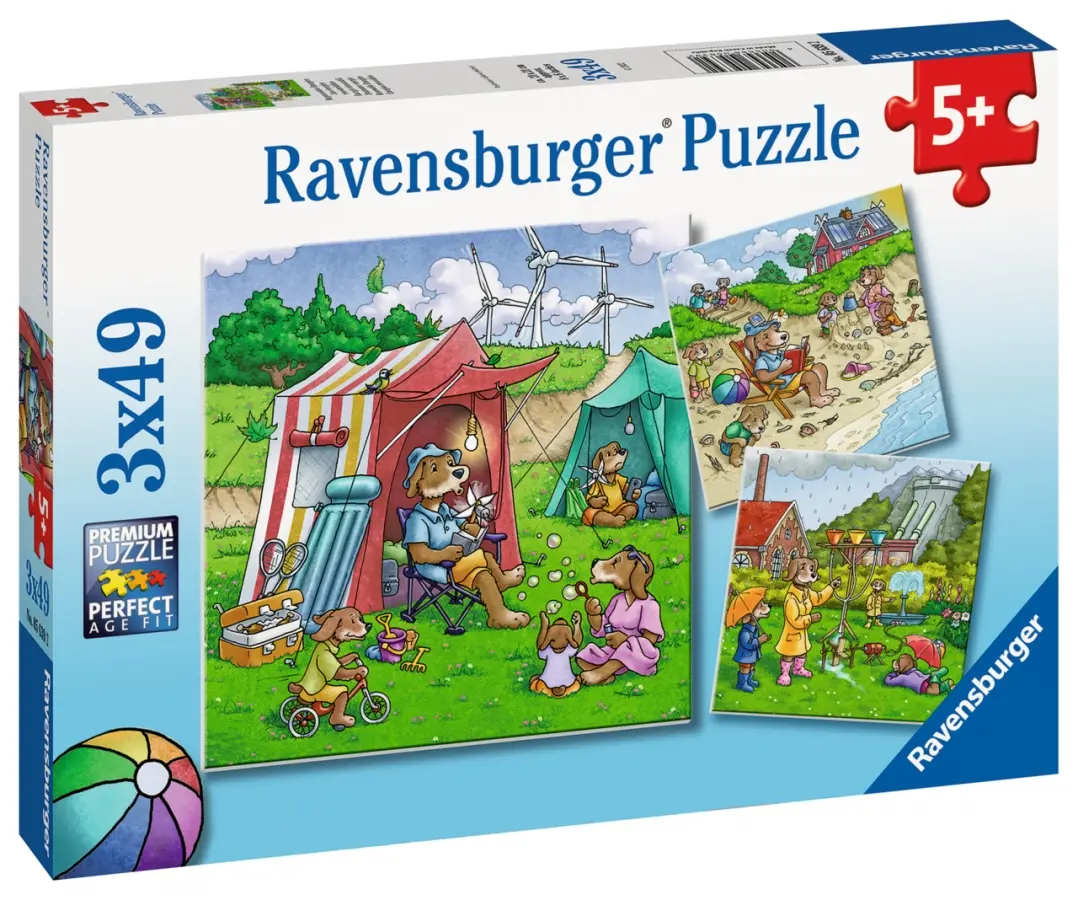 Tre pussel på 49 bitar vardera, med olika motiv från en hundfamiljs semester. De har varit ute och campat vid en vindkraftspark, de har haft en rolig dag på stranden och lekt med vatten i trädgården en regnig dag.