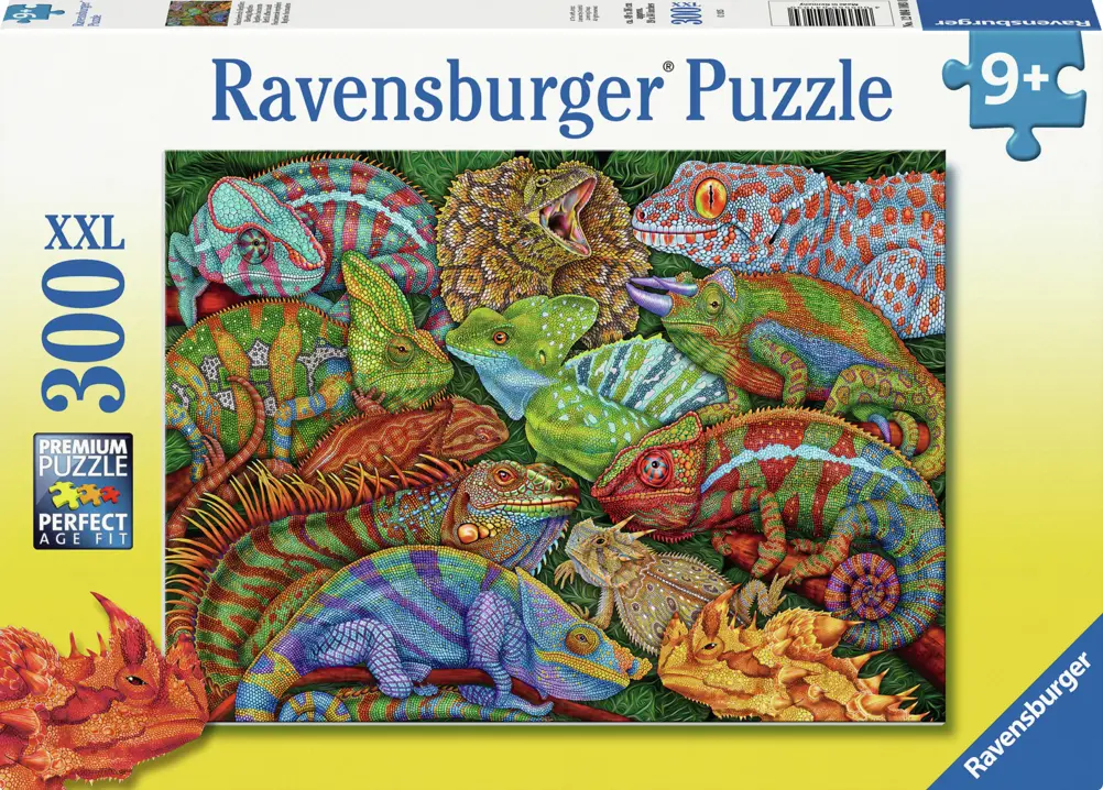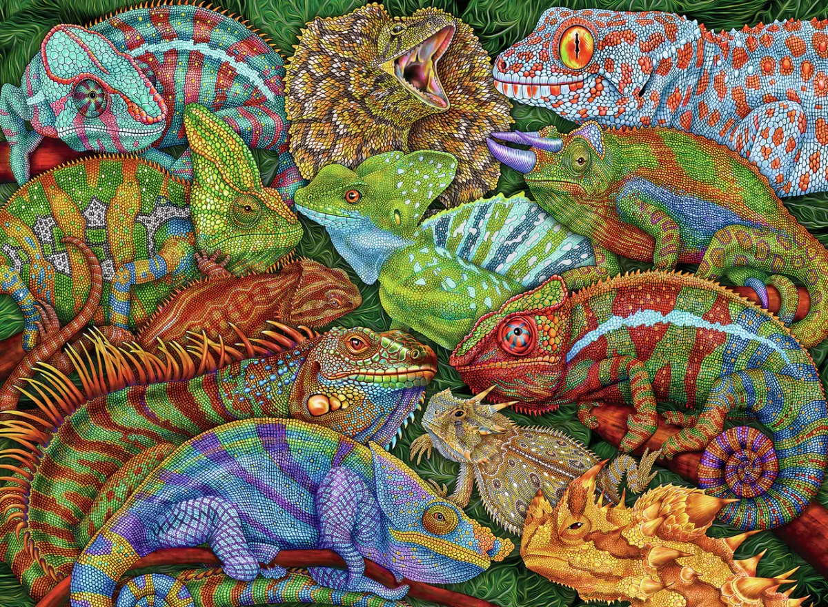 En mängd färgglada reptiler har samlats på gräset. Här syns bland annat kameleonter, leguaner, basilisker och kragagamer! Ett perfekt pusselmotiv för dig som gillar en utmaning i färg och form.