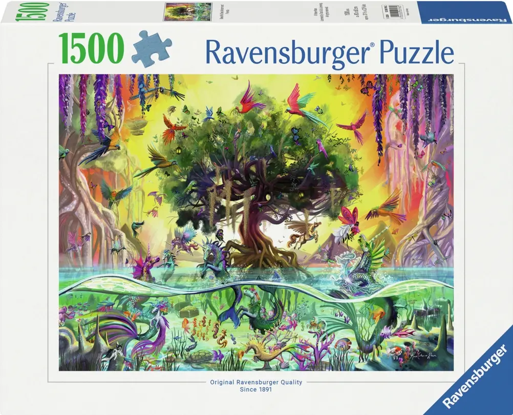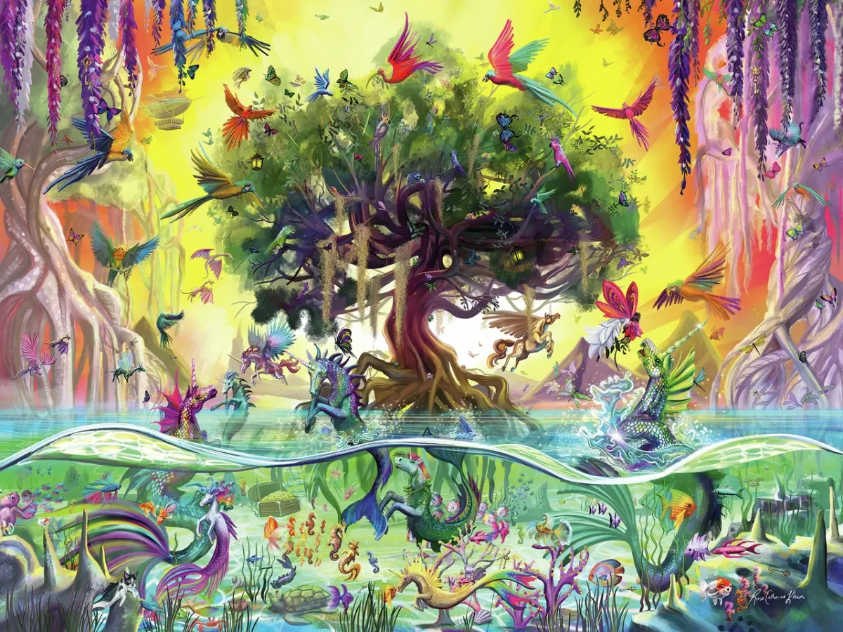 I ett magiskt träsk, med kristallklart vatten och vackra träd, lever fantastiska djur och sagoväsen sida vid sida. Här finns enhörningar som flyger men också havsenhörningar som lever i havet bland sjöhästar, fiskar och andra fantasiväsen. Ett motiv fullt av färg och liv!