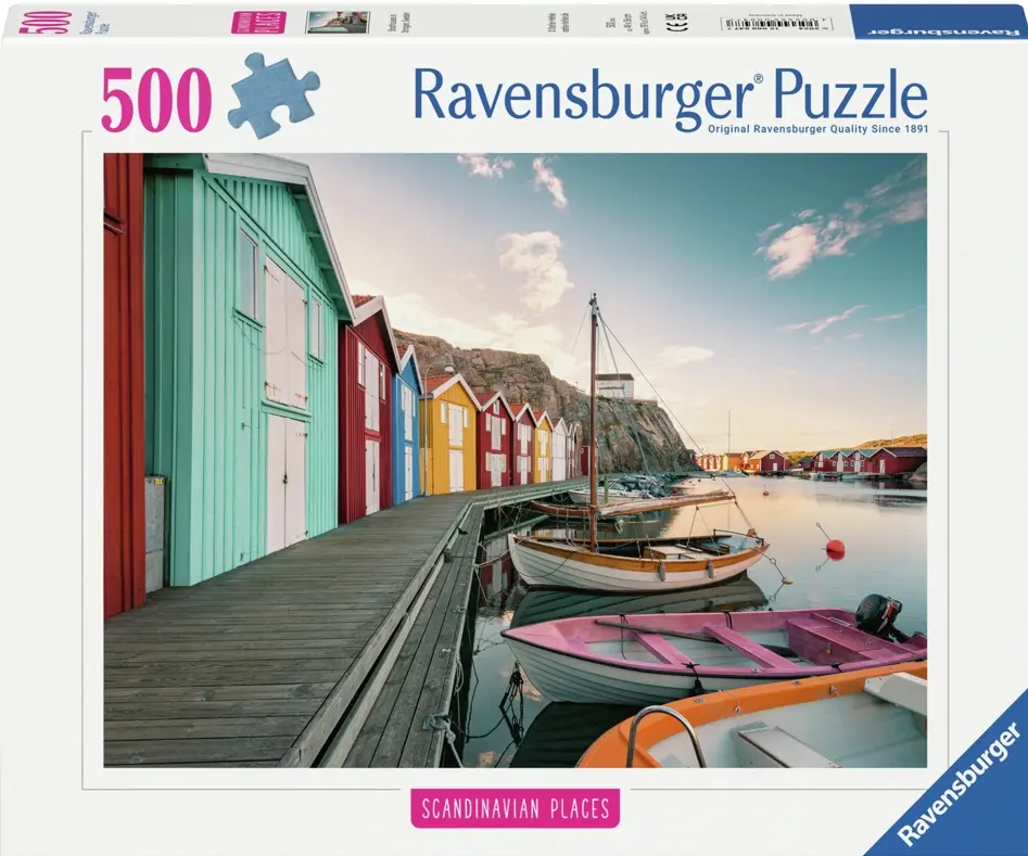Det är en lugn morgon i Smögen och solen är på väg upp över kobbar och skär. Havet ligger spegelblankt och vid bryggan står färgglada båtar förtöjda. Längs med bryggan står också Smögens typiska sjöbodar, även de med färgglada fasader.