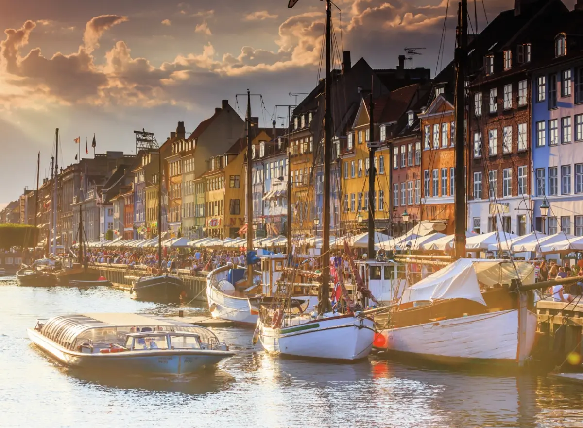 Nyhavn i Köpenhamn, Danmark. Det är en solig men lite disig sommardag och kajens många restauranger är proppfulla av gäster. De färggranna husfasaderna är upplysta av solen som strålar ner mellan molnen och hamnen är full av segel- och turistbåtar.
