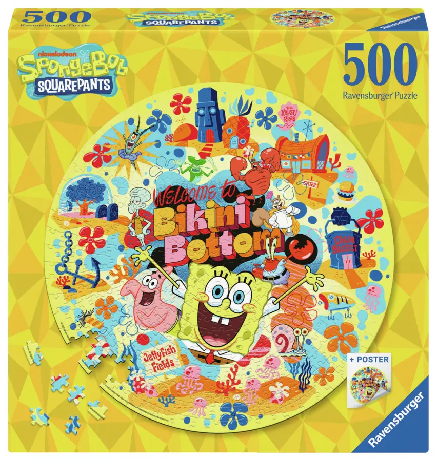 Ett runt sprudlande pussel med Nickelodeon-favoriten Svampbob Fyrkant i centrum.