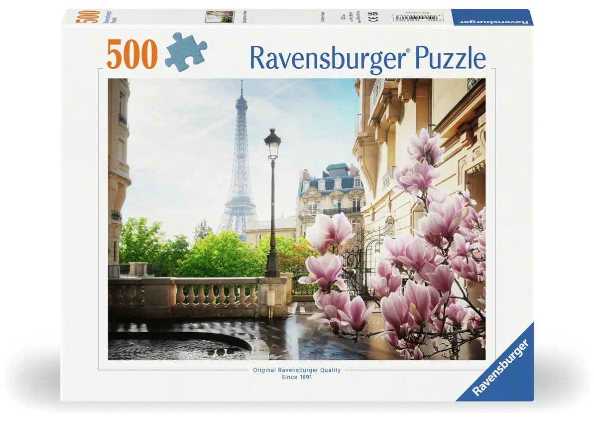 Från en vändplan vid ett vackert sekelskifteshus i beigt får vi utsikt över det berömda Eiffeltornet. Det har nyss regnat och kullerstenarna är blöta, en magnifik magnolia i rosa toner sträcker ut sig i förgrunden och en svart lyktstolpe i äldre stil sträcker upp sig mot den ljusa himlen. Några trädkronor med krispigt gröna löv skymtas också centralt i pusselbilden och tillför en välkommen färgklick i motivet.