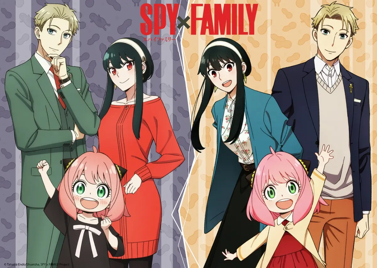 Motiv från mangaserien "Spy x Family", vi ser tå familjeporträtt av familjen Forger som är huvudkaraktärer i serien.