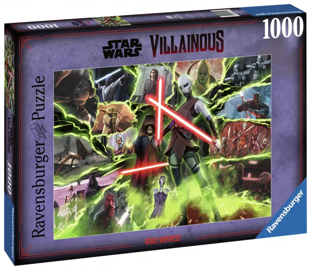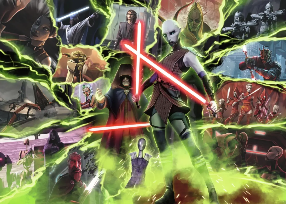 I det här motivet står Ventress i centrum med sina dubbla lasersablar. I bakgrunden bland gröna blixtar hittar vi kända tecknade karaktärer från Star Wars.