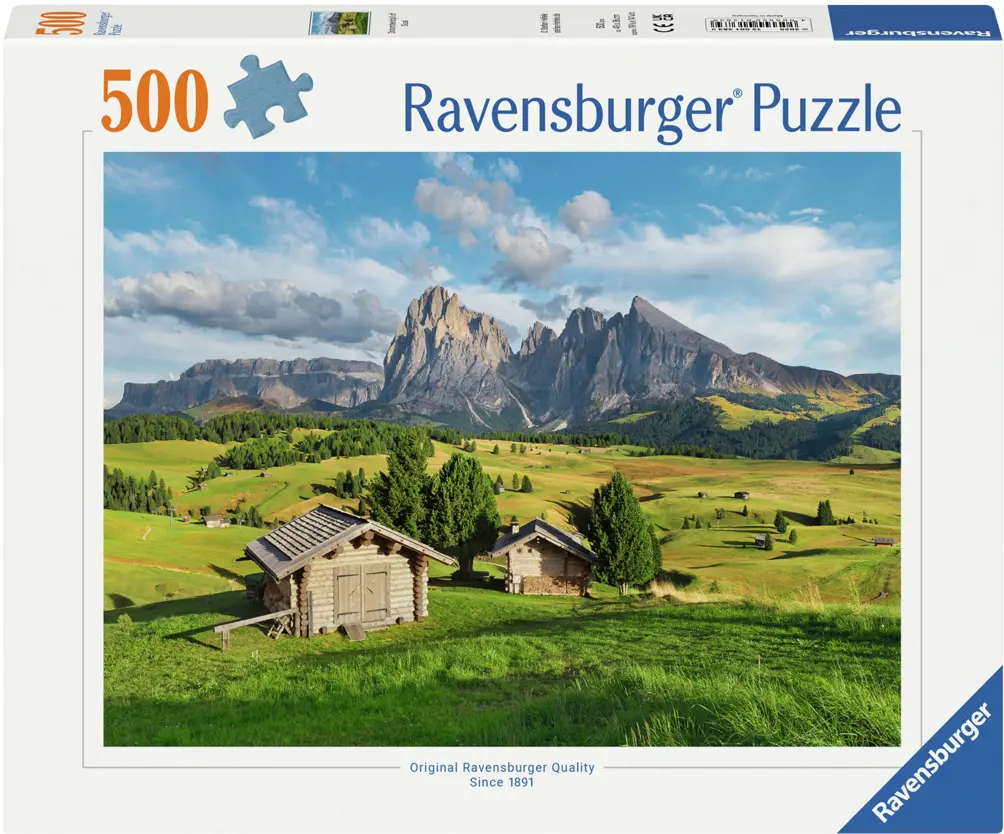 På böljande fält, med dramatiska klippor i bakgrunden, ligger små timmerhus. Det är en solig dag med vita moln mot en blå himmel, och på fälten växer partier av barrträd.