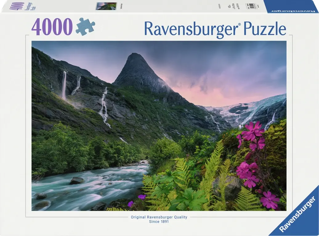 Någon stans bland bergen sträcker sig en spetsig bergstopp högre än allt runtomkring. Vid sidan syns en glaciär som sakta smälter ner i vattenfall längs med klipporna. De mynnar ut i en brusande älv med grönska omkring sig och färgstarka cerisa blommor.