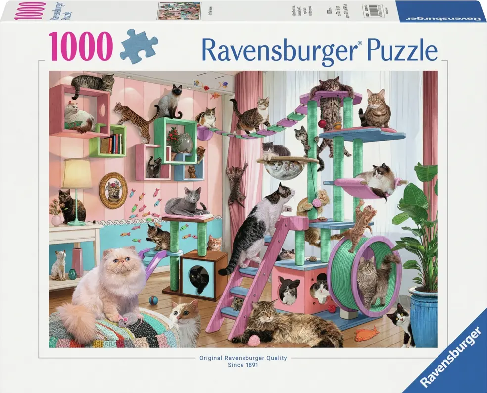 I katternas rum finns alla leksaker en katt kan önska sig! Katträd som liknar en hinderbana, bokhyllor att kliva på, fiskar på väggen, möss att bita i och garnnystan att bolla runt med. Ett rum i rosa, blått och mintgrönt, som är fullt av olika sorters katter.