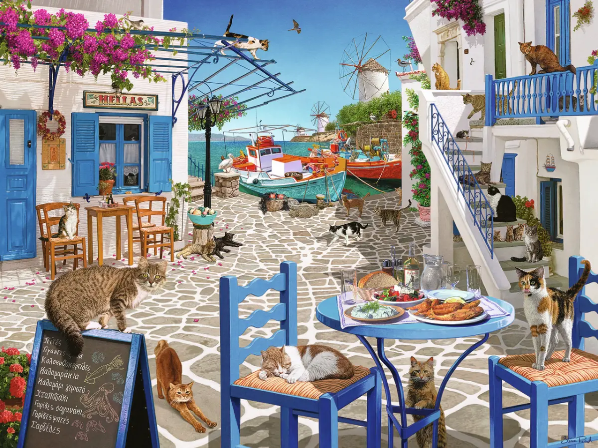 Det är en varm sommardag på den grekiska ön Mykonos i Egeiska havet, känd för sina vitkalkade husfasader, knall blå dörrar och praktfulla bougainvillea. Fiskebåtarna ligger förtöjda vid kajen och inga människor syns ännu till, så stadens alla katter passar på att ha en härlig stund tillsammans.