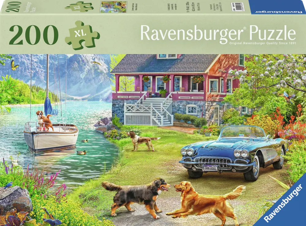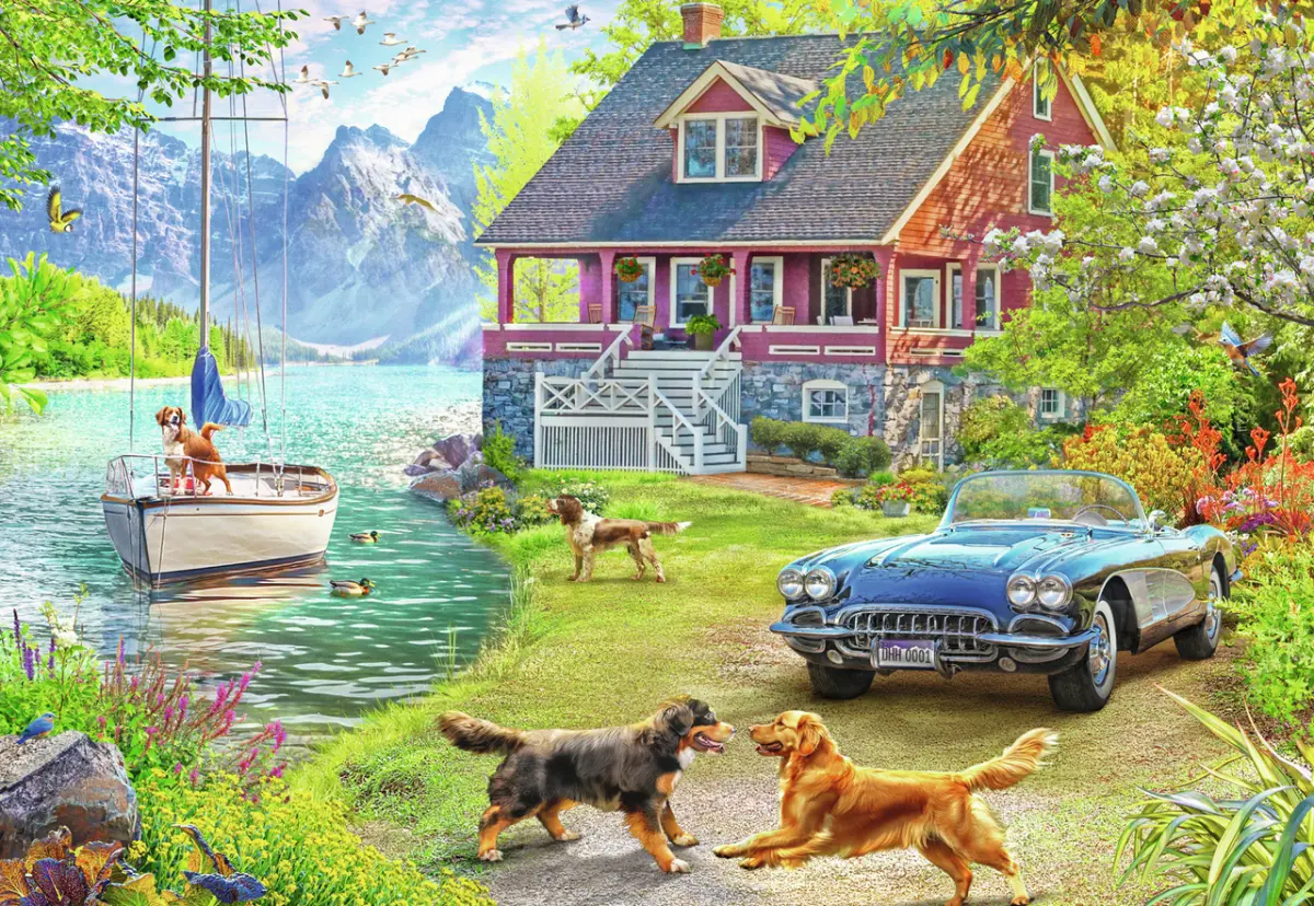 Ett rosa hus ligger vackert beläget vid en sjö, och i bakgrunden skymtas gröna skogar och branta bergsryggar. I vattnet guppar en segelbåt och en hund som står i fören ser minst sagt seglarsugen ut! Några fler hundar leker i den grönskande trädgården och på uppfarten står en snygg veteranbil parkerad med glänsande blå lack.