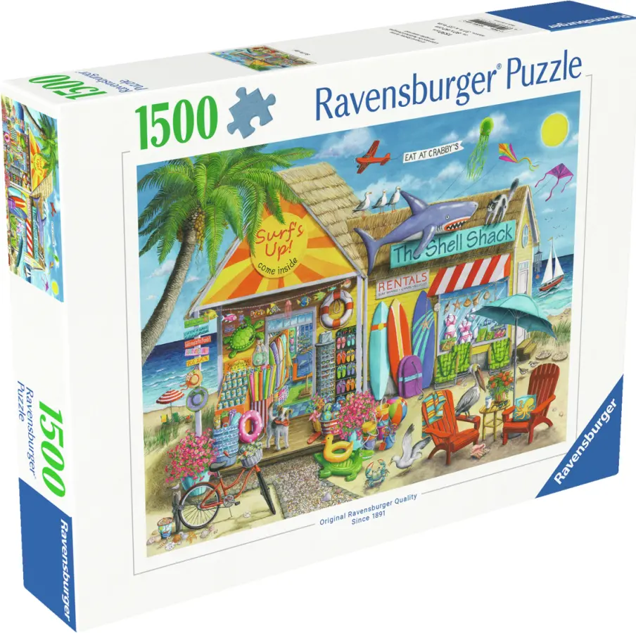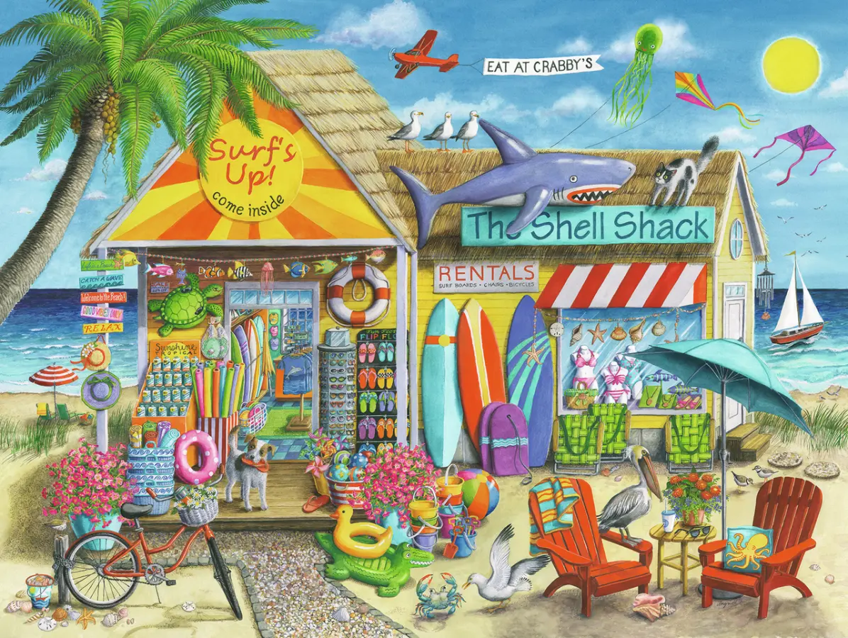 Det är en solig dag och butikerna Surf's up! och The Shell Shak är öppna och redo för strandens alla kunder! Här kan man köpa allt som behövs för en härlig dag vid havet, eller varför inte hyra cykel eller en surfbräda för lite rolig aktivitet. Ett pusselmotiv med mycket färg och detaljer, skapat av Ingrid Slyder.