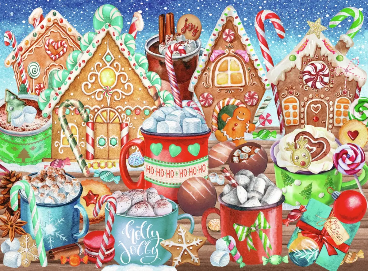Ett riktigt sött motiv (i ordets båda betydelser) med pepparkakor, pepparkakshus, varm choklad med marshmallows och massor av godis. Happy holidays!