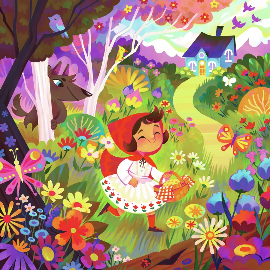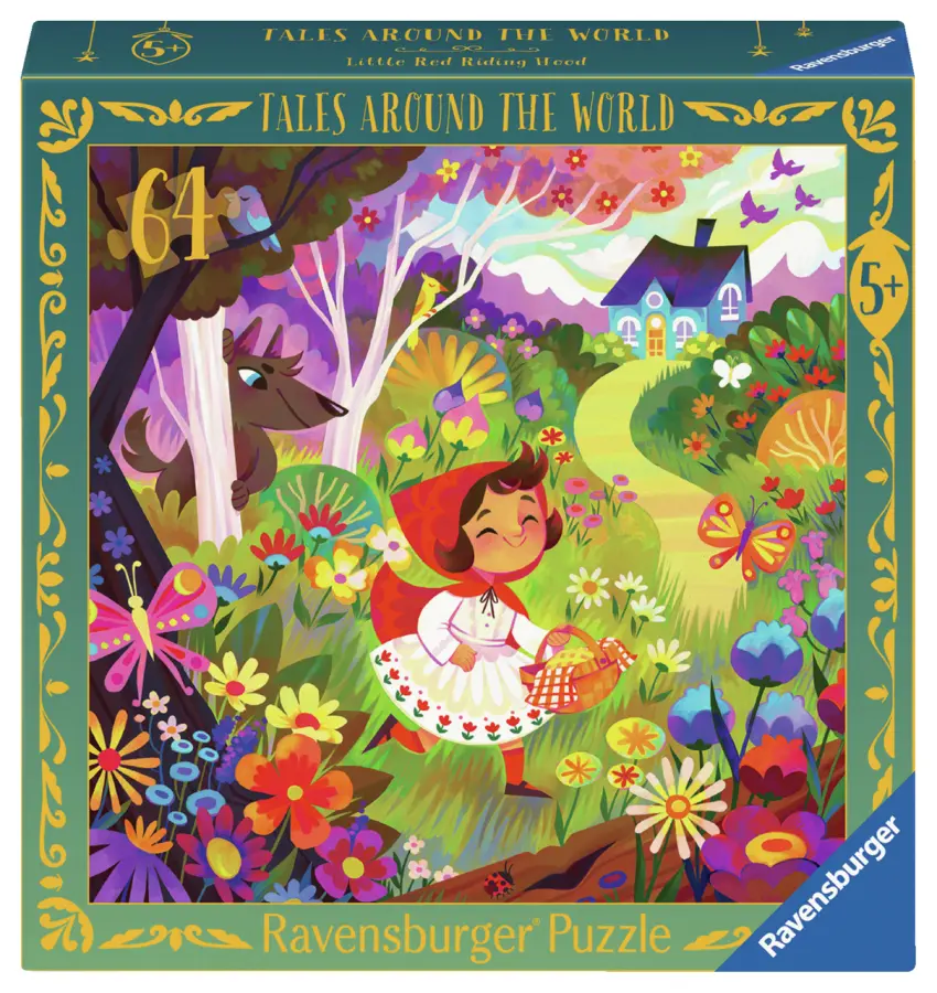 Ett färgglatt pusselmotiv ur sagan om Rödluvan och vargen. Rödluvan är glatt på väg genom skogen med en korg med vin och kakor till sin kära mormor. men bakom träden lurar den listiga och elaka vargen!