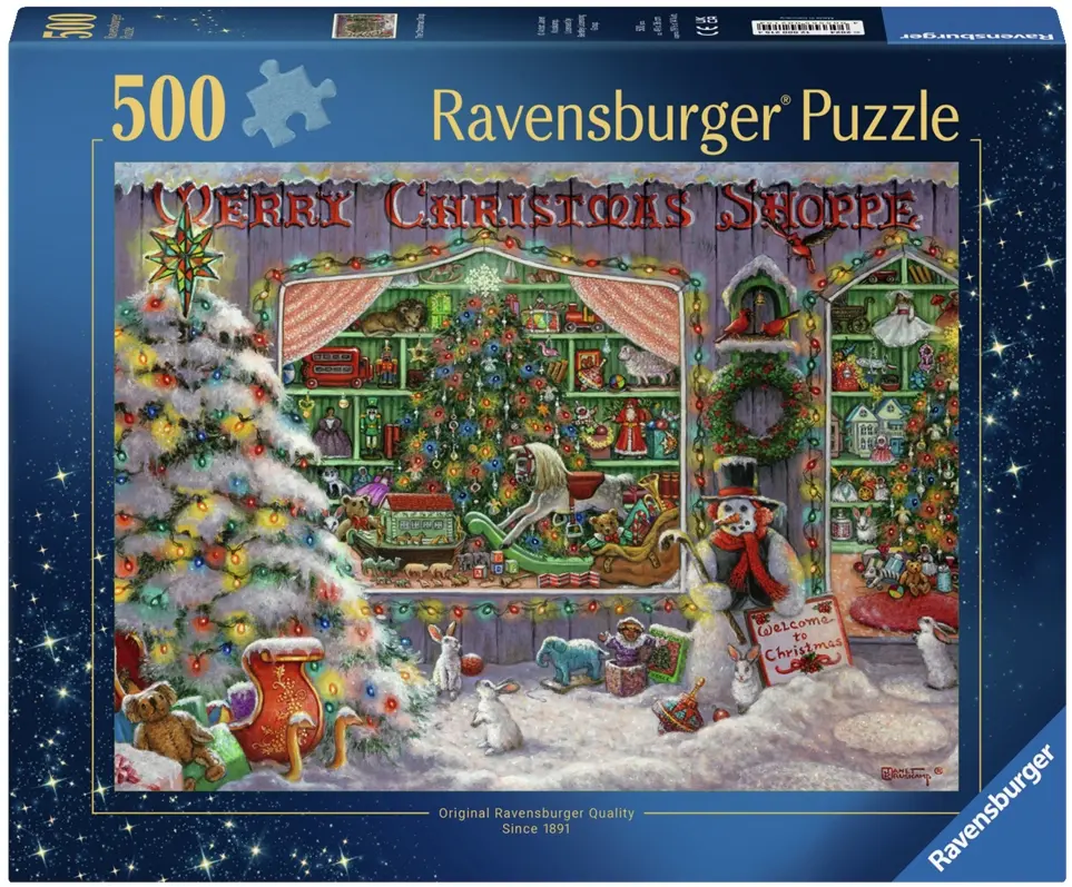 Det är Jul och vi står utanför en välfylld leksaksbutik med ett inbjudande skyltfönster. Utanför ligger snön vit och bland leksaker, Julgranar och snögubbar hoppar små vita kaniner. Ett pussel som sprider både Julglädje och förväntningar inför Julafton, vad önskar du dig?