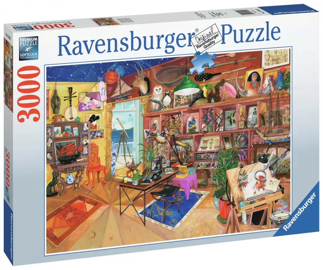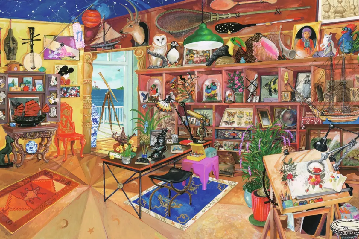 I det här rummet finns lite av varje, uppstoppade djur trängs med instrument, konstföremål, miniatyrmodeller och tavlor. vid ett staffli håller en illustration av en ros att ta form och på altanen står kikaren redo för den som vill titta på stjärnorna ikväll.