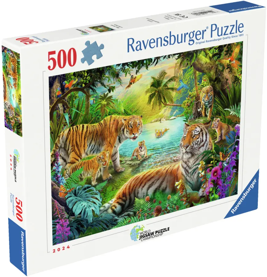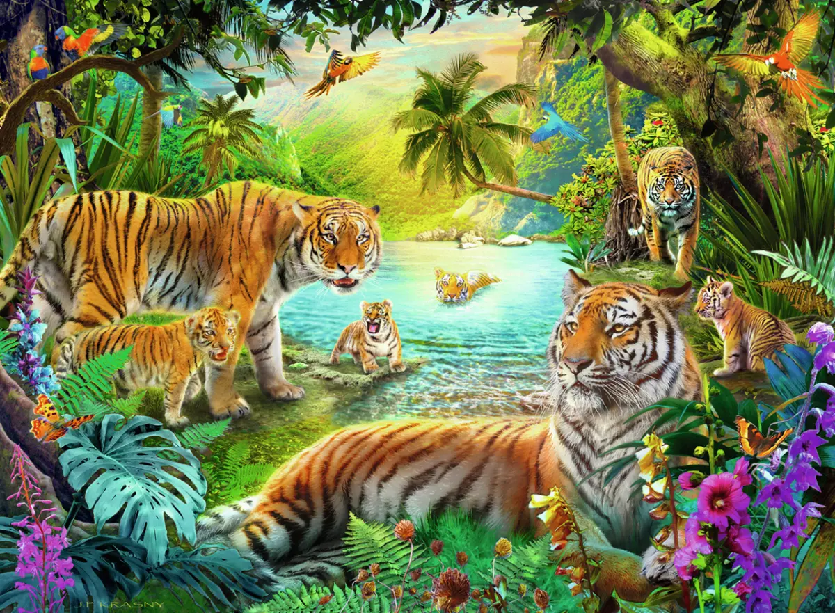 Vid en kristallklar sjö i regnskogen har en tigerfamilj samlats för att svalka sig. Här ger palmerna skugga, det växer lila blommor i förgrunden och i luften flyger fjärilar tillsammans med färgglada papegojor. I bakgrunden skymtas solens strålar över gröna berg.