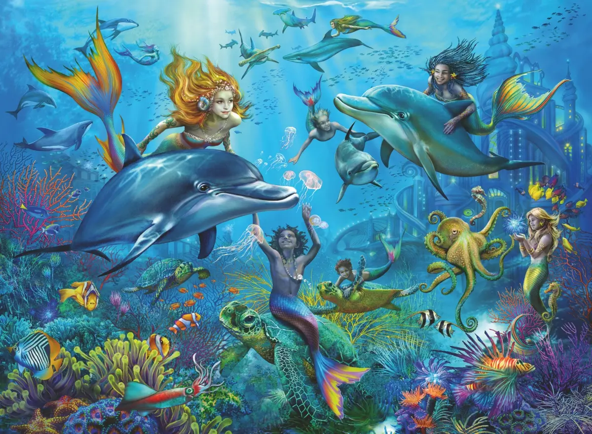 Följ med de busiga havsmänniskorna på äventyr med djuren! Här finns det många havsarter, såsom delfiner, havssköldpaddor, maneter, bläckfiskar med mera.