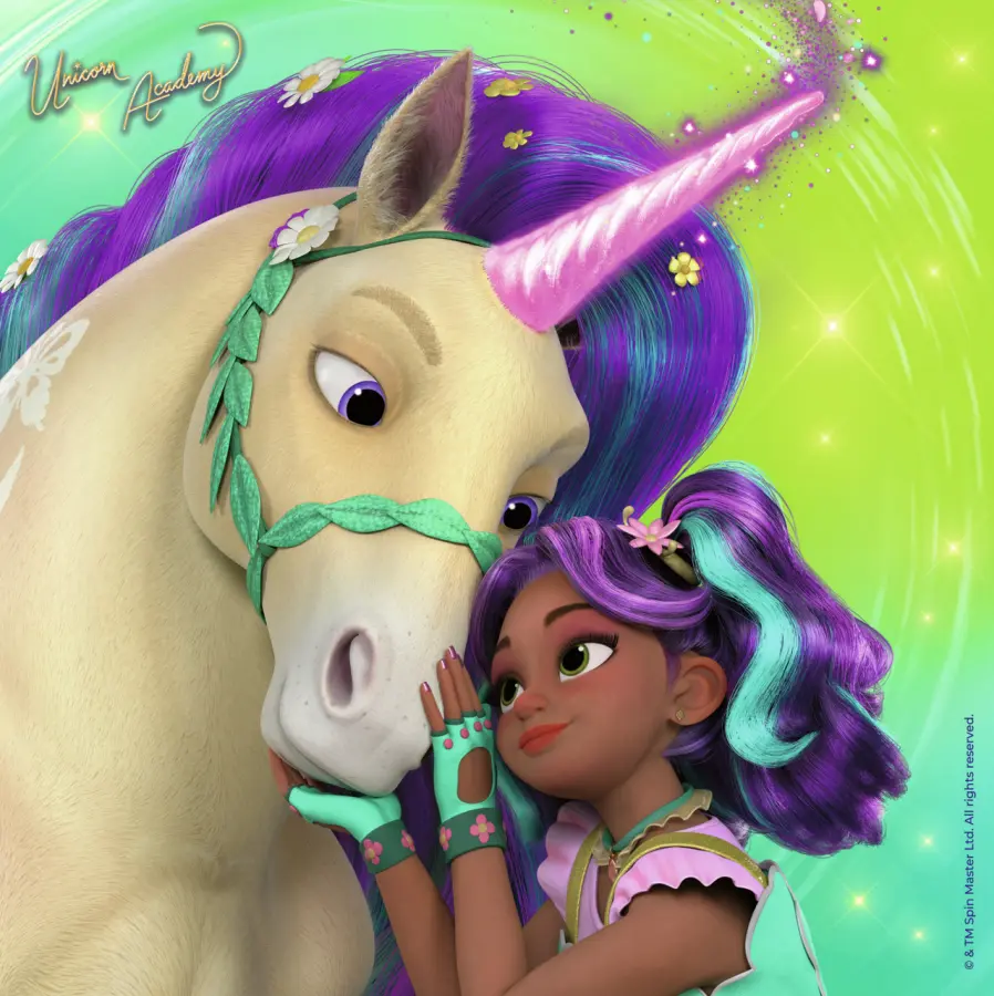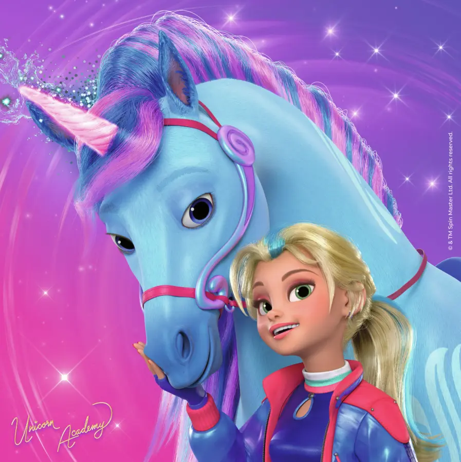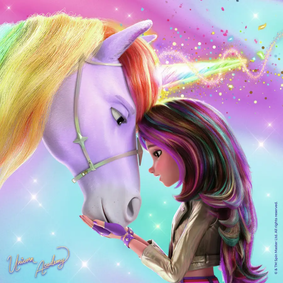 Tre skimrande pusselmotiv ur Netflix serien Unicorn Academy, på 49 bitar vardera.