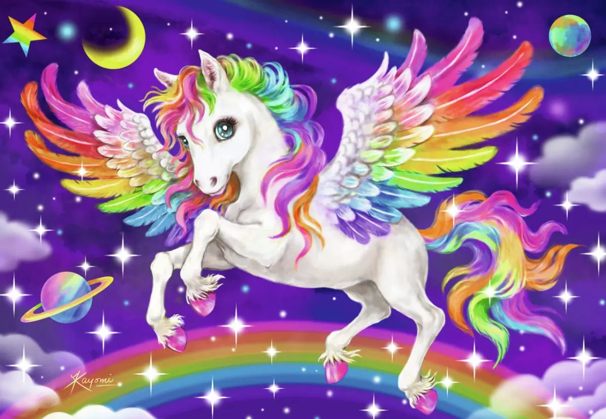 I ett motiv ser den bevingade hästen Pegasus flygande över en regnbåge och i bakgrunden syns en stjärnbeströdd natthimmel.