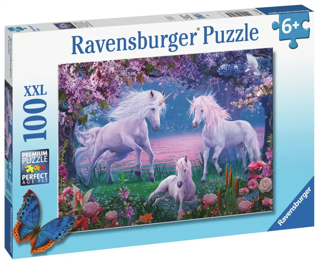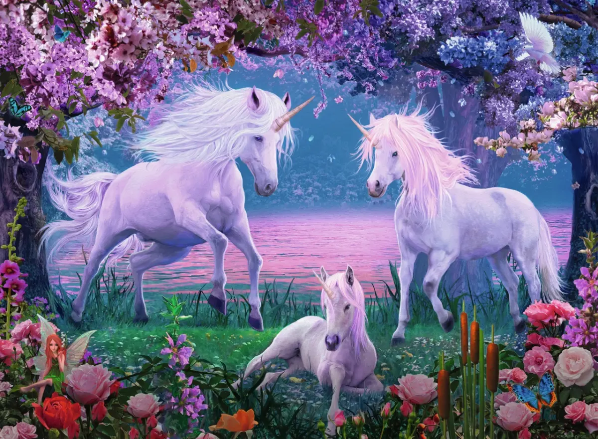 En enhörningsfamilj leker på en äng vid en sjö. De är omgivna av rosa blommor som ger ett rosa skimmer över hela motivet. I kanterna finns spännande detaljer som en liten älva, en fjäril och en vit duva.