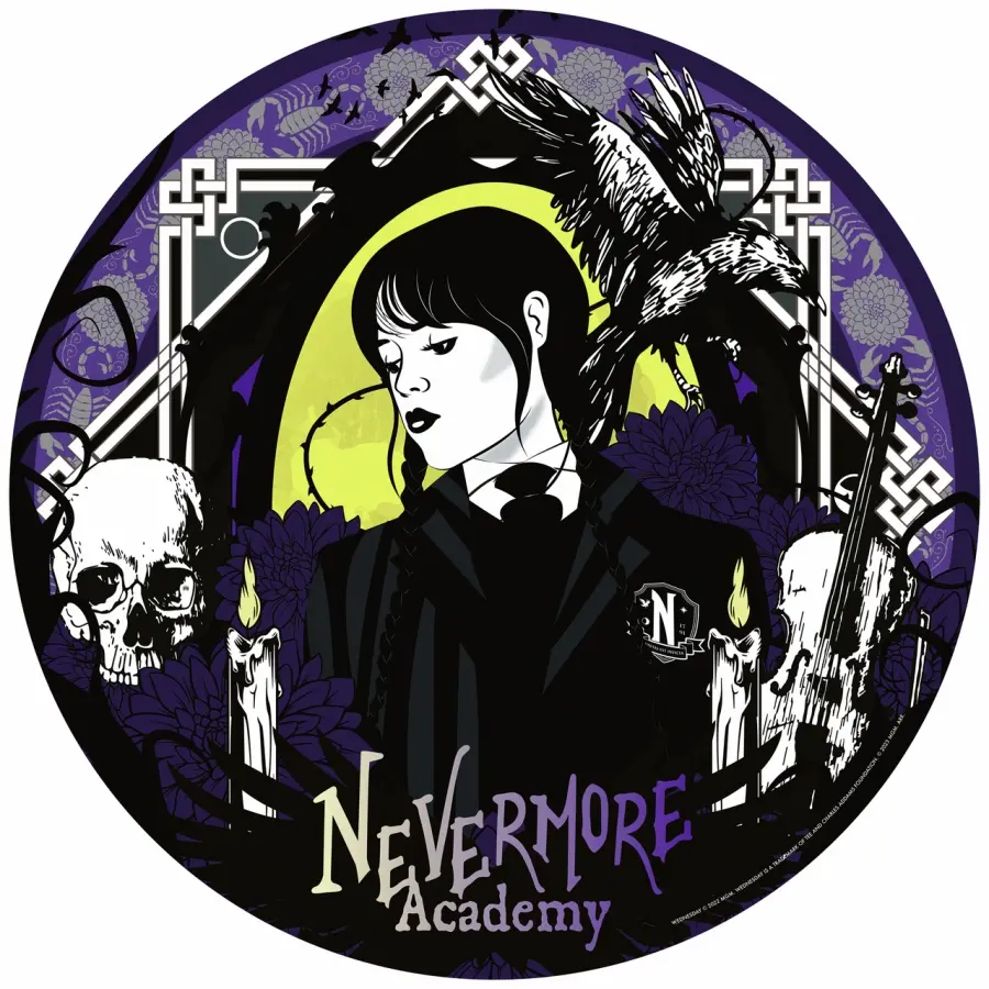 Motiv ur TV-serien Wednesday. I bild ser vi huvudkaraktären Wednesday Adams illustrerad i svart, vitt, gult och lila. Omkring henne syns tända ljus, en döskalle, en svart korp och en fiol.